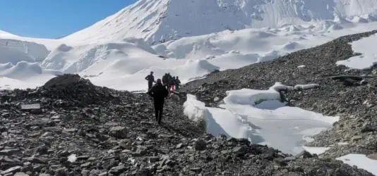 世界之巅珠穆朗玛峰下,连流石滩也常被积雪掩埋。