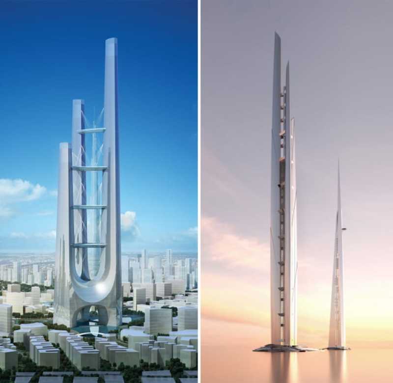 左图:迪拜1号的渲染图,这是一座未实现的 1,000m+ 巨高摩天大楼。在该公司的一英里高摩天大楼的概念之一中可以看到它的相似之处(在吉达塔设计旁边的渲染图中显示)。