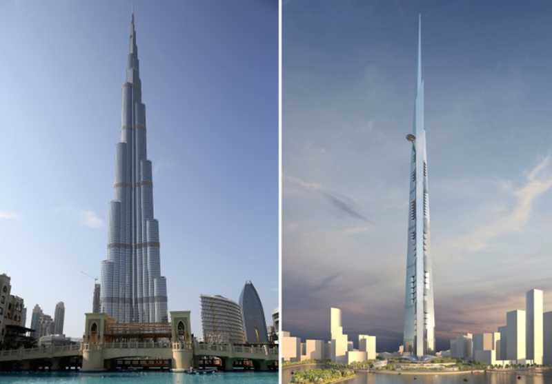 迪拜哈利法塔(左)与沙特阿拉伯的摩天大楼吉达塔渲染图(右)