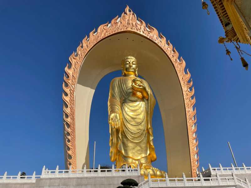 全世界最高的阿弥陀佛金神像,东林大佛,位于江西省九江市温泉镇的庐山山麓,这里是是佛教净土宗的发源地,2007年动工,于2013年建成,它代表当代最高水平的艺术精品,仔细观察这尊佛像,会发现它看起来十分的贵气,雄伟,建造东林大佛投资了十多亿,全身上下用黄金装裱,使用足足48公斤黄金为大佛镀金。