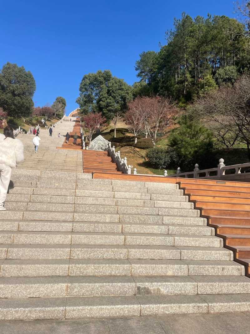 上来的台阶有两条路,右边黄色的木质台阶是信途道,要三步一叩,一路拜上去,左边的大理石是游客通道,可以正常走上去,上来之后我们可以看到一个莲花底座,这个莲花底座跟上面阿弥陀佛他手上托的是一比一的大小