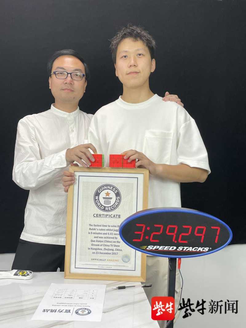 同时抛接三个小球你能做到吗?抛接三个魔方呢?在抛接的过程中还原呢?今年8月,“抛接同时解开三个魔方”新吉尼斯世界纪录正式诞生,00后小伙李志淏以3分29秒的成绩完成了“抛接解”一体的超高难度魔方挑战。扬子晚报记者联系到了李志淏,听到他讲述从一名普通大学生到七项吉尼斯世界纪录拥有者的经历。李志淏表示,“我相信每个人都有自己擅长的领域,正如吉尼斯的初衷—发现每个人的不可思议。”