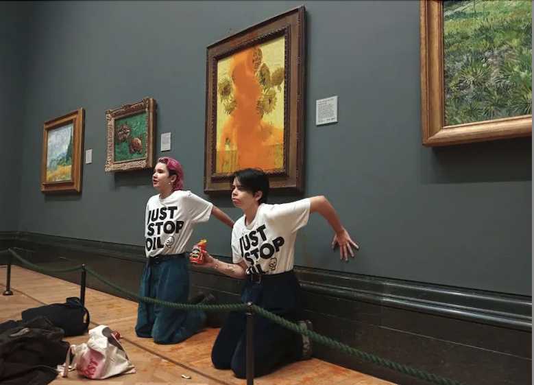 在今冬欧洲的生活成本危机之下,英国气候正义团体Just Stop Oil的抗议行动引发了争议:10月,两名年轻抗议者走进伦敦国家美术馆,打开两罐亨氏番茄汤扔向了梵高的著名画作《向日葵》,并向观众喊道:“你更关心一幅画,还是保护我们的星球和人类?”
