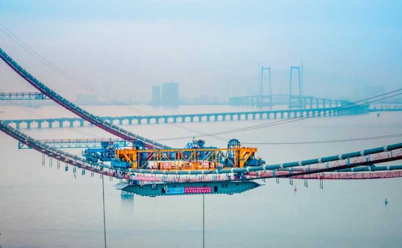 为确保首榀钢箱梁顺利吊装,项目建设团队多次召开专家评审会议,联合海事、气象等部门精心研究施工安全技术方案,对整个吊装过程进行反复推演。“吊装时需要将该钢箱梁平稳提升到海面之上91米,相当于将1个篮球场停放的100辆小汽车,一口气提升至30层楼高度。”中交二航局深中通道项目副总工程师蒋明鹏介绍:“此次吊装作业采用承载力850吨缆载吊机,其以悬索桥的主缆为支撑,就像一台‘缆车’,在百米高空走‘钢丝’,能够轻松将80头成年非洲象吊上百米高空。”