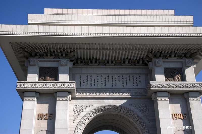 平壤凯旋门看上去规模宏大,整座建筑一共了用1万多块花岗石砌成,有3层歇山式的屋顶,柱檩之间配有各式装饰,体现了朝鲜传统建筑特点。在凯旋门的上方雕刻有《金日成之歌》的歌词。