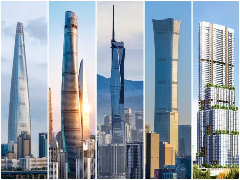 大厦名称:乐天世界大厦建筑总高度:555米楼层:123层建筑设计:KPF这座超级摩天大楼是韩国人民的骄傲,它是东北亚已建成的最高摩天楼,曾长期位居世界第5高楼,目前已退出前五,位居全球第6高。